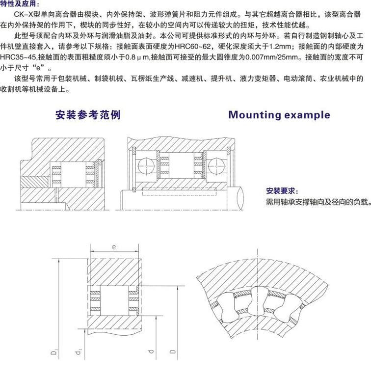CK-X型單向離合器由楔塊、內外保持架、波形彈簧片和阻力元件組成。